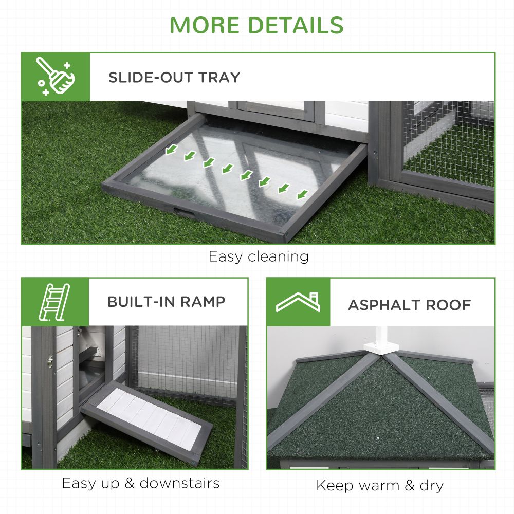 Provide your chickens with the freedom and comfort they desire while ensuring their safety and security with the PawHut Wooden Chicken Coop. This versatile product combines a coop, a nesting box, and an outdoor run all in one, allowing your chickens ample space to roam, a cozy place to roost, and plenty of fresh outdoor air at their leisure.