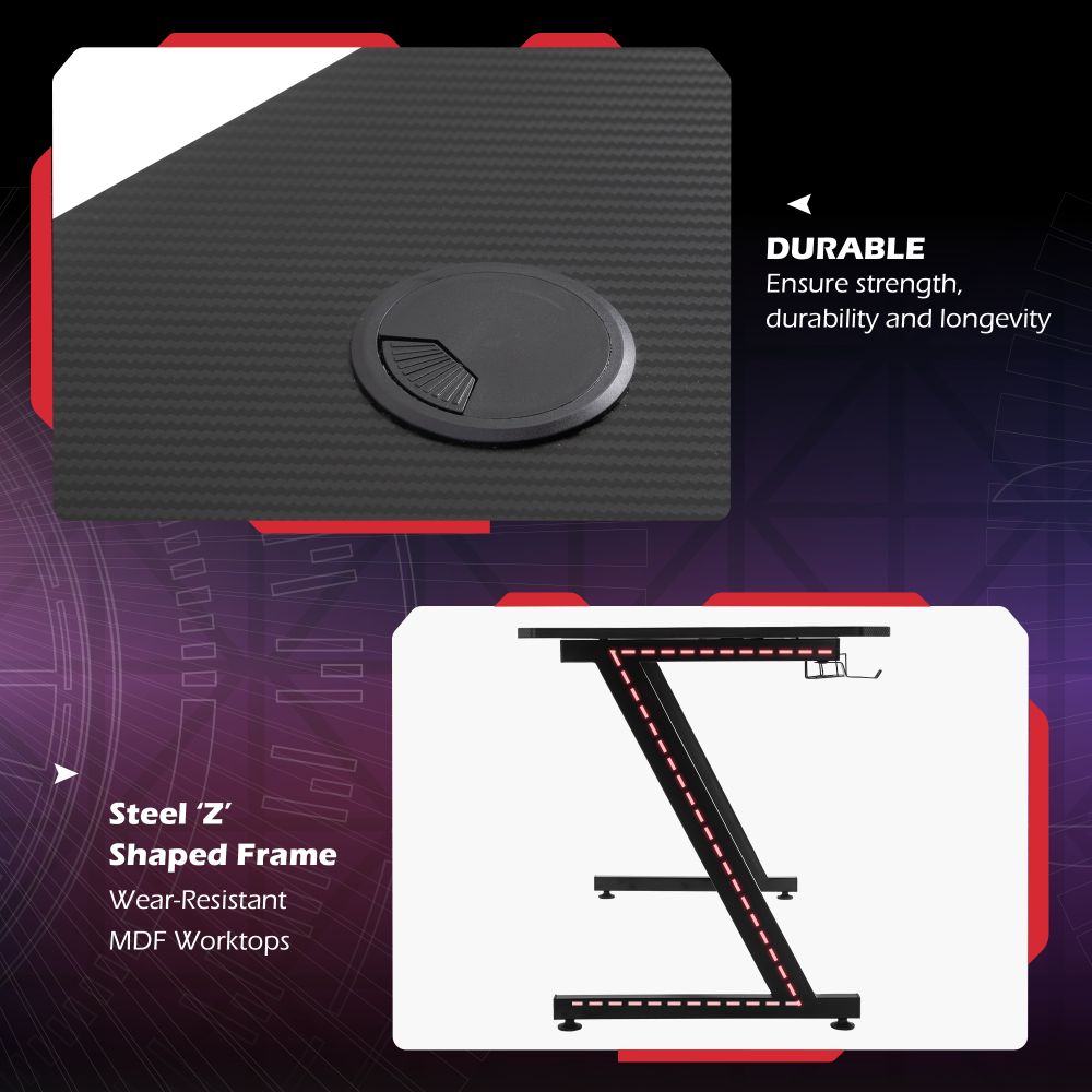 • Spacious Design: Enjoy a large worktop complemented by a convenient side cup holder and headphone hook, ensuring that all your devices and gaming essentials are within easy reach.