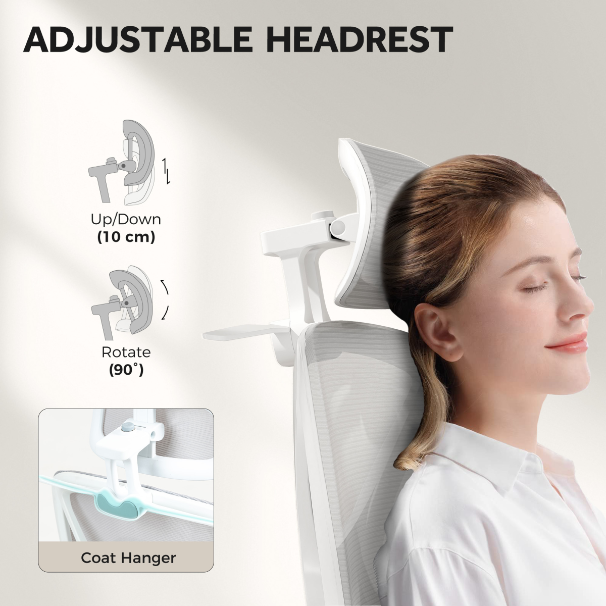● Ergonomic headrest with coat hanger adjusts for optimal neck support