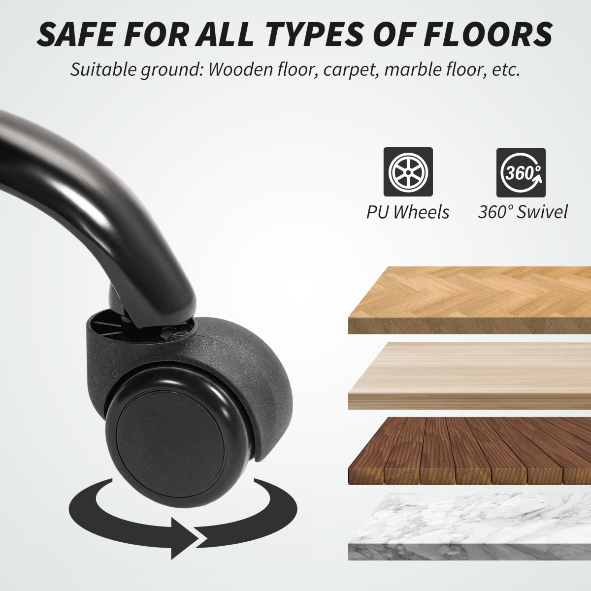 ● Swivel seat and wheels for effortless mobility. Large PU wheels are floor-friendly, glide quietly and smoothly