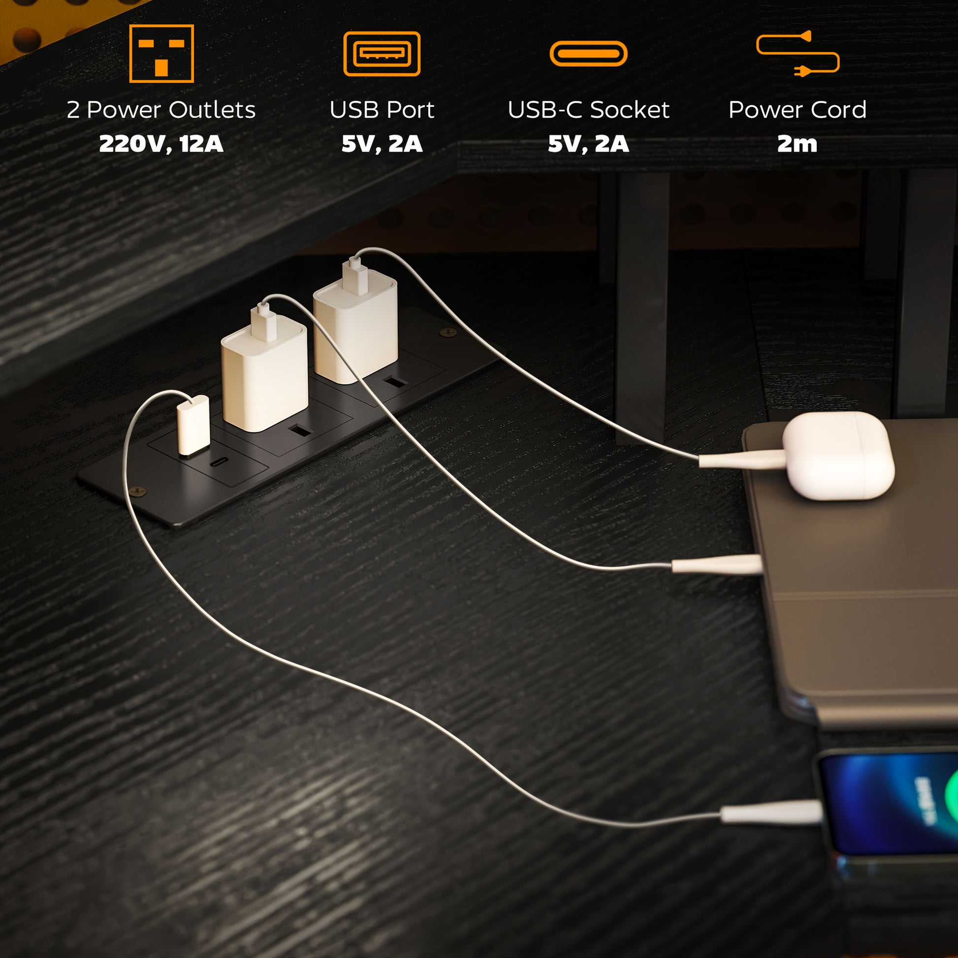 - Integrated power outlets, USB-A port, and USB-C socket for convenient charging